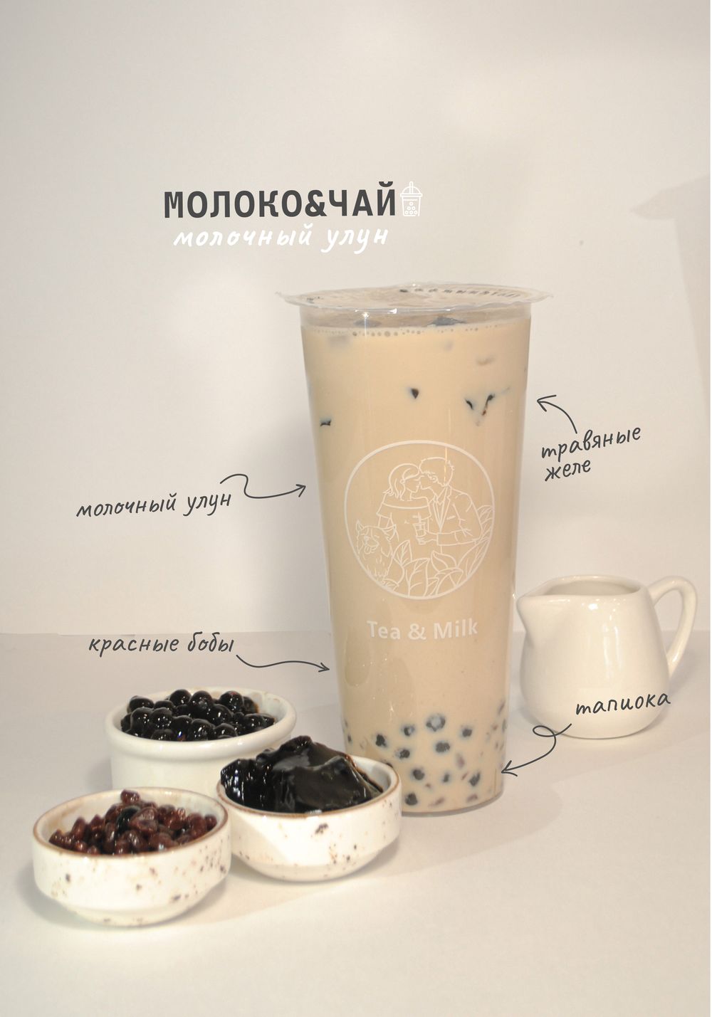 Молочный улун, молоко, тапиока, травяное желе, красные бобы
