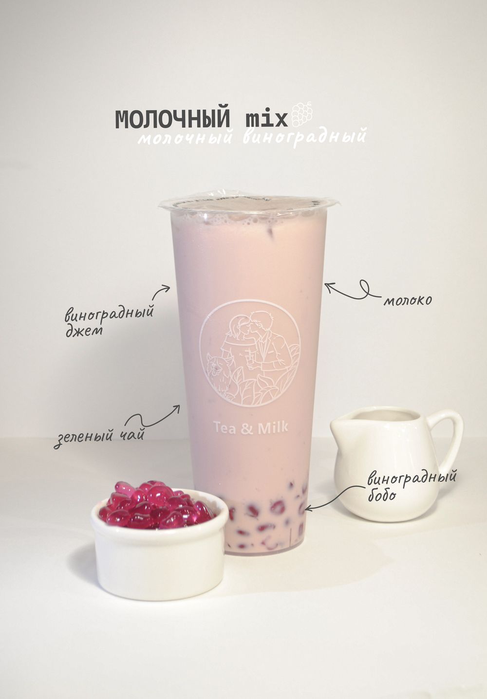 Молоко, зелёный чай, сливки, виноградный бобо